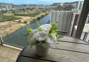 Corner end residence in Seaside Suites overlooking the Ala Wai canal with mountain and golf course view. This 1-bedroom unit features granite counter tops, dishwasher, self-cleaning oven, updated bathroom, and engineered wooden floors. Relax on your large lanai or in the private garden area. There is coin operated laundry next to your unit and on every floor.